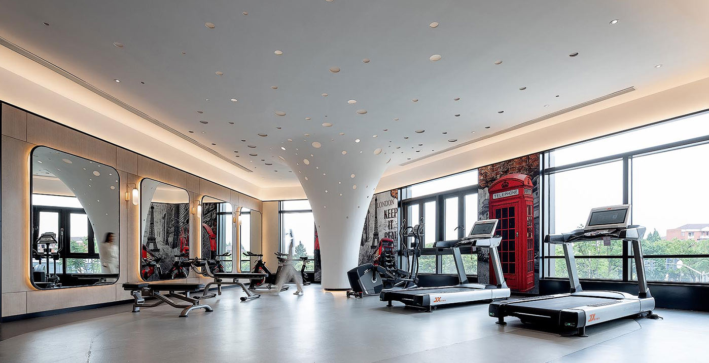 健身房以修建师“遗忘”在室内的一根柱子为室内设计师解决问题的起点,,,,,将柱子塑造成树的形态,,,,,不但迎合了睿景旅馆精神中的重视自然的生涯态度,,,,,与健身房乐活康健的精神内核也不约而同。。。。。